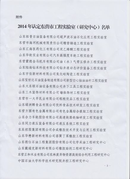 一单位获2014年东营市工程研究中心认定